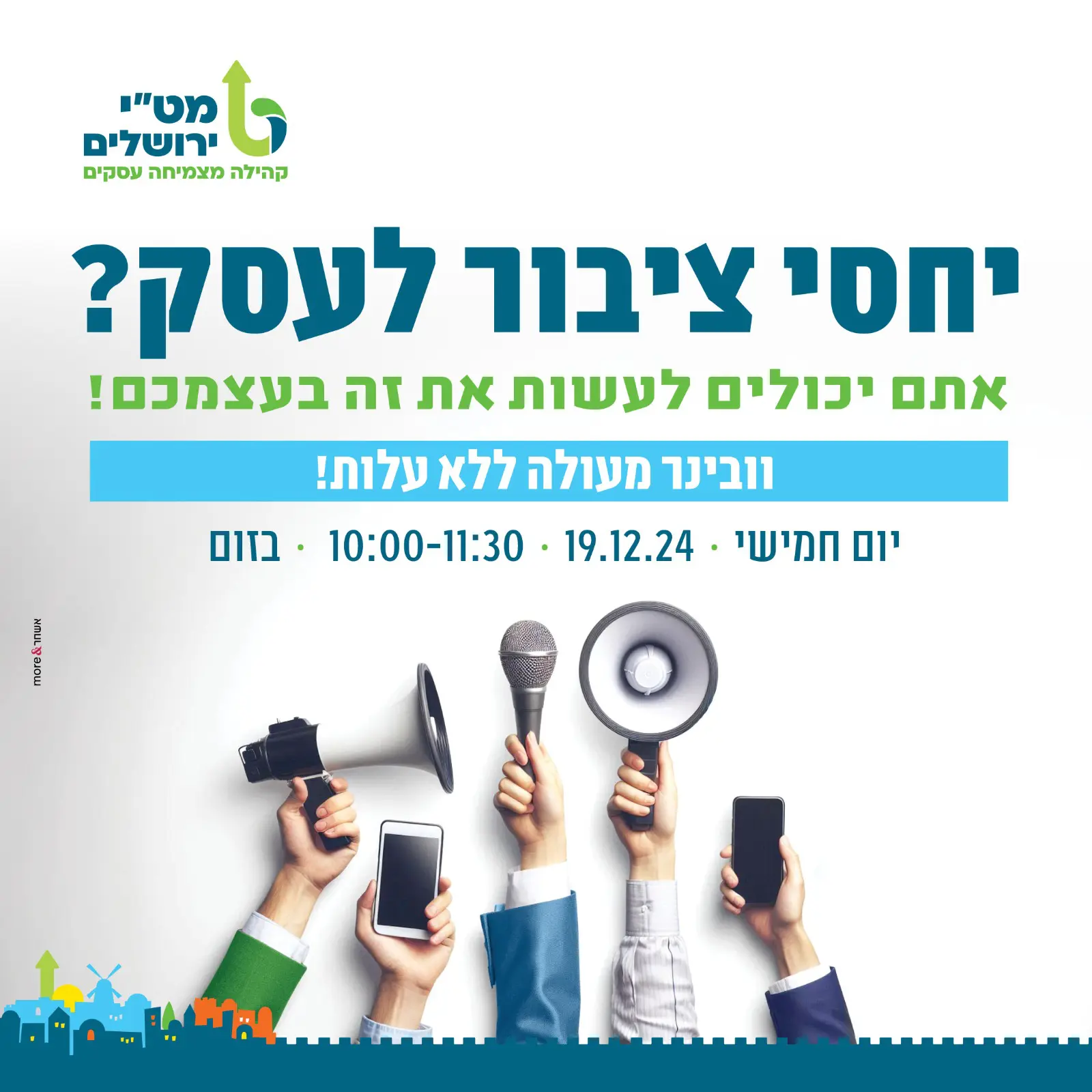 הרצאה חווייתית המפגישה עסקים קטנים ובינוניים עם תחום יחסי ציבור וגם מעניקה כלים ליצירת הזדמנויות בשיטת DIY - עשו זאת בעצמכם לחשיפה תקשורתית רב ערוצית עבור פעילותכם העסקית.